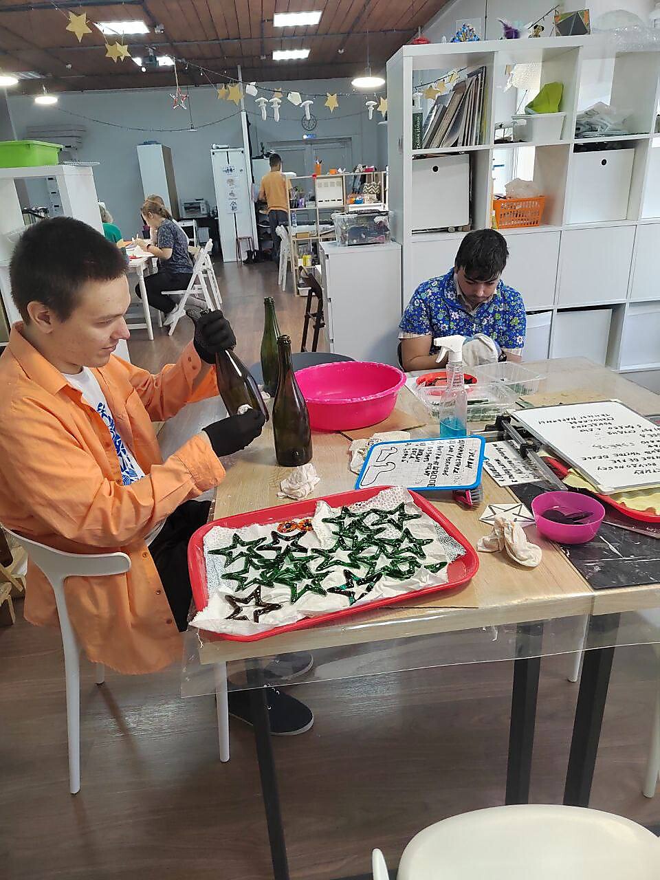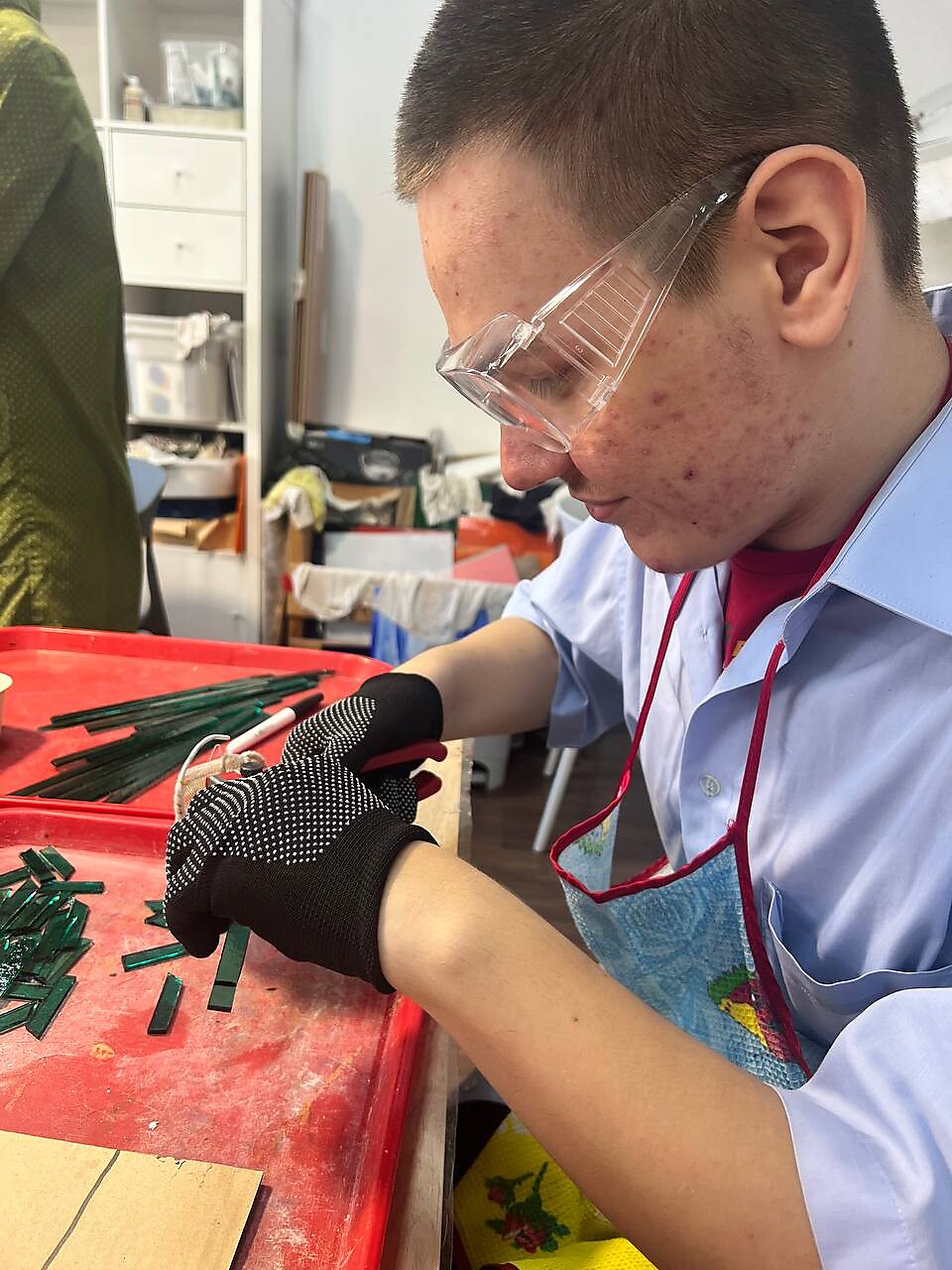 Недавно вспоминали какими ребята пришли в Центр. Руслан очень долго не подходил к витражной мастерской — переживал из-за опасных инструментов и осколков стекла. А сейчас режет и складывает звезды.