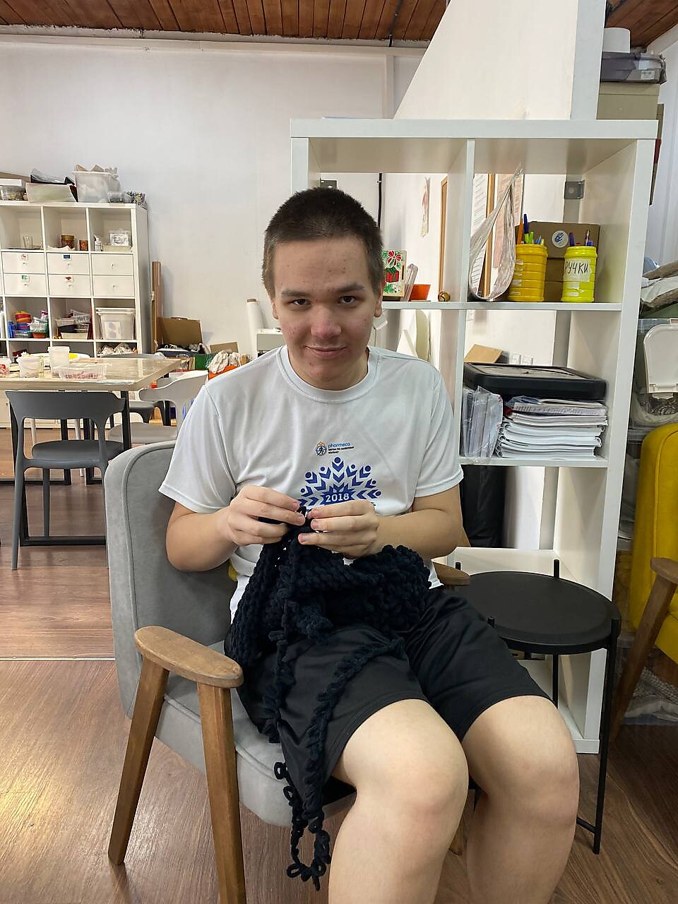Тьюторы составляют расписание, учитывая все предпочтения Руслана и он спокойно снимает халат и садиться вязать свою новую подушку курицу.